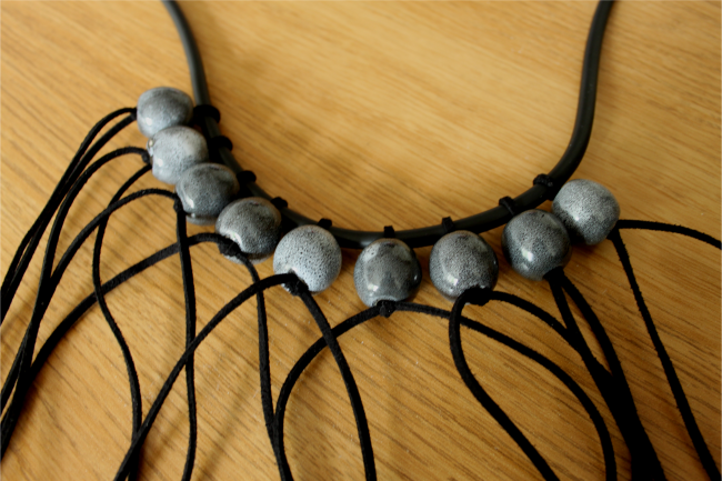 3. Przełóż pierwszy rzemyk przez naszyjnik, złóż w połowie  i nawlecz koralik na oba jego końce. Nawlecz w ten sposób wszystkie rzemyki.